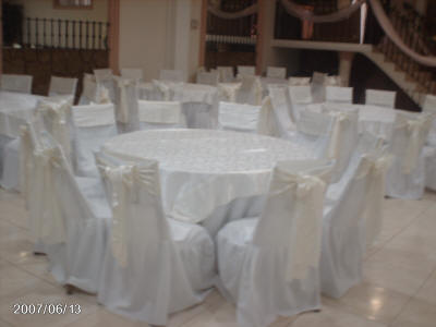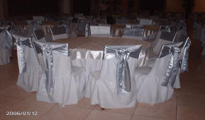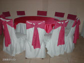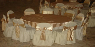 Cápelo Blanco en silla tiffany en color rosa fresa o mexicano con cubre mantel brocado en dibujo de flores y mantel largo con adorno de moño en la banda. | Cápelo beige doble en gasa espejo con cápelo beige de fondo en banda color verde limón y cubre mantel liso. | Silla tiffany con banda entrelazada en color perla satinado sin moño, cubre mantel brocado en color paja con dibujo de grecas, mantel blanco largo. |