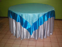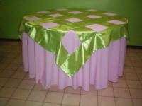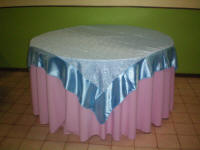 Cubre mantel en organza con vivos y mantel rosa | Cubre mantel turquesa con mantel rosa mate |