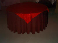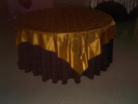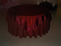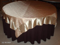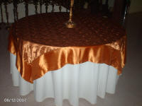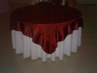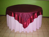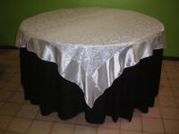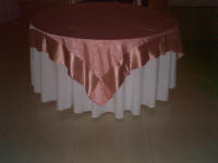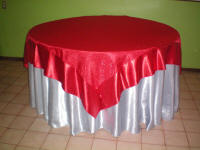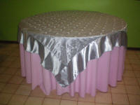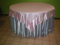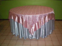 Cubre mantel a cuadros con mantel plata satinado. | Cubre mantel rosa viejo en crepe bordado con mantel plata satín | Cubre mantel brocado con mantel plata satín | Cubre mantel rojo brocado con mantel plata satín | Cubre de cuadros con mantel rosa mate | Cubre mantel vino brocado con mantel rosa | Cubre mantel plata brocado con mantel chocolate |